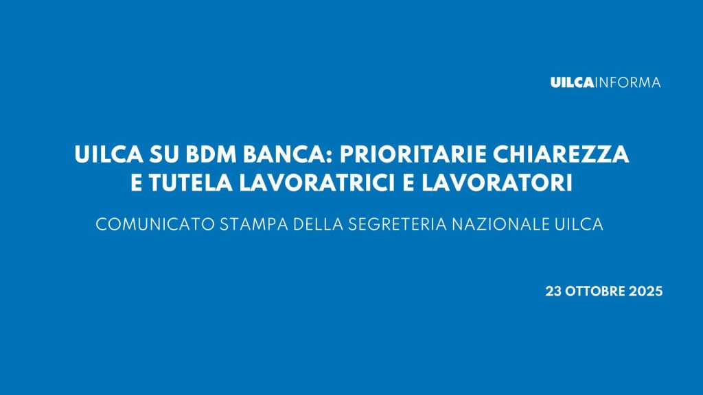 “È necessaria la massima chiarezza sull’ipotesi di vendita delle quote di BdM Banca da parte del Governo ed esprimiamo la nostra preoccupazione perché le dichiarazioni del ministro dell’Economia e delle Finanze Giancarlo Giorgetti aprono scenari di incertezza. Noi crediamo vada garantita la continuità di un istituto importante nelle dinamiche del Paese, soprattutto per il Mezzogiorno, ed evitare ricadute negative in termini economici, normativi, professionali e occupazionali”, così il segretario responsabile Uilca Gruppo BdM Banca Ugo Pojero commenta l’informativa della banca, illustrata alle Organizzazioni Sindacali durante un incontro ottenuto in data odierna dai Sindacati, in anticipo rispetto al 29 ottobre. “Prendiamo atto oggi, dalle parole del responsabile risorse umane Mediocredito Centrale Alessandro Papaniaros, che non è stato deciso nulla ma il livello di allerta della Uilca resta massimo”.