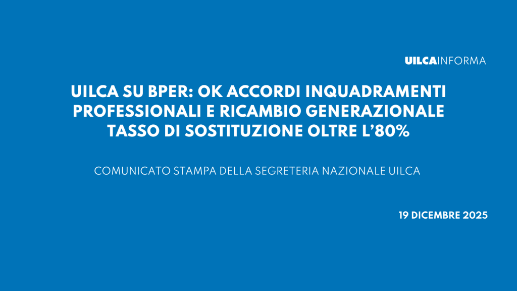 “Positivo il nuovo accordo sugli esodi e sulle assunzioni che garantisce un ricambio generazionale dell’83,25%. Si tratta di un risultato importante, frutto del confronto sindacale, che si inserisce nel solco degli accordi già raggiunti nel 2021, 2023 e 2024. Ancora una volta viene confermato come nel Gruppo le relazioni sindacali proficue rappresentino sempre un valore aggiunto e uno strumento fondamentale per tutelare l’occupazione, valorizzare le persone e accompagnare i processi di riorganizzazione aziendale. L’obiettivo, come Uilca, è garantire livelli occupazionali stabili e coerenti con il nuovo assetto del Gruppo in vista della fusione con Banca Popolare di Sondrio”, commenta il segretario nazionale Uilca Giuseppe Bilanzuoli.