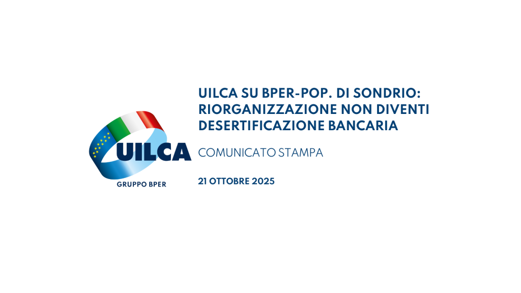 “La riorganizzazione che deriva dalla fusione tra Bper e Banca Popolare di Sondrio dovrà garantire un ricambio generazionale adeguato, in risposta alla manovra di esodi volontari già annunciata. Un ulteriore punto di attenzione riguarda la sovrapposizione degli sportelli prevista nell’ambito dell’operazione di incorporazione: sarà nostro impegno, come Uilca, vigilare affinché il processo di razionalizzazione non si trasformi in desertificazione bancaria e non penalizzi le lavoratrici e i lavoratori coinvolti, né clientela e territori”, così Paolo Tassi, segretario responsabile Uilca Gruppo Bper commenta l’informativa della Popolare di Sondrio, illustrata oggi alle Organizzazioni Sindacali, sull’avvio del processo di fusione per incorporazione della banca in Bper, ufficializzato lo scorso 17 ottobre. “Chiediamo un tavolo negoziale vero, che parta dai territori e dalle esigenze concrete di chi lavora”.