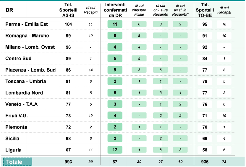A livello nazionale la rete sportelli passerà da 993 unità, di cui 90 recapiti, a 936 unità di cui 73 recapiti. Qui di seguito potrete trovare il dettaglio per singole direzioni regionali.